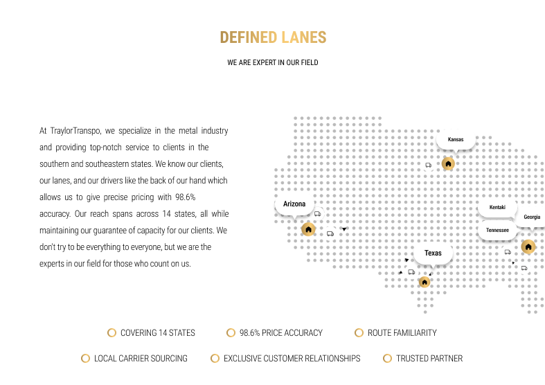 TraylorTranspo automates the transportation process for manufactures and processors in the United States. Our efficient Hybrid Carrier network and advanced technology eliminate paperwork hassle. Get precise pricing in clear geographical Lanes. Experience seamless efficiency with us.